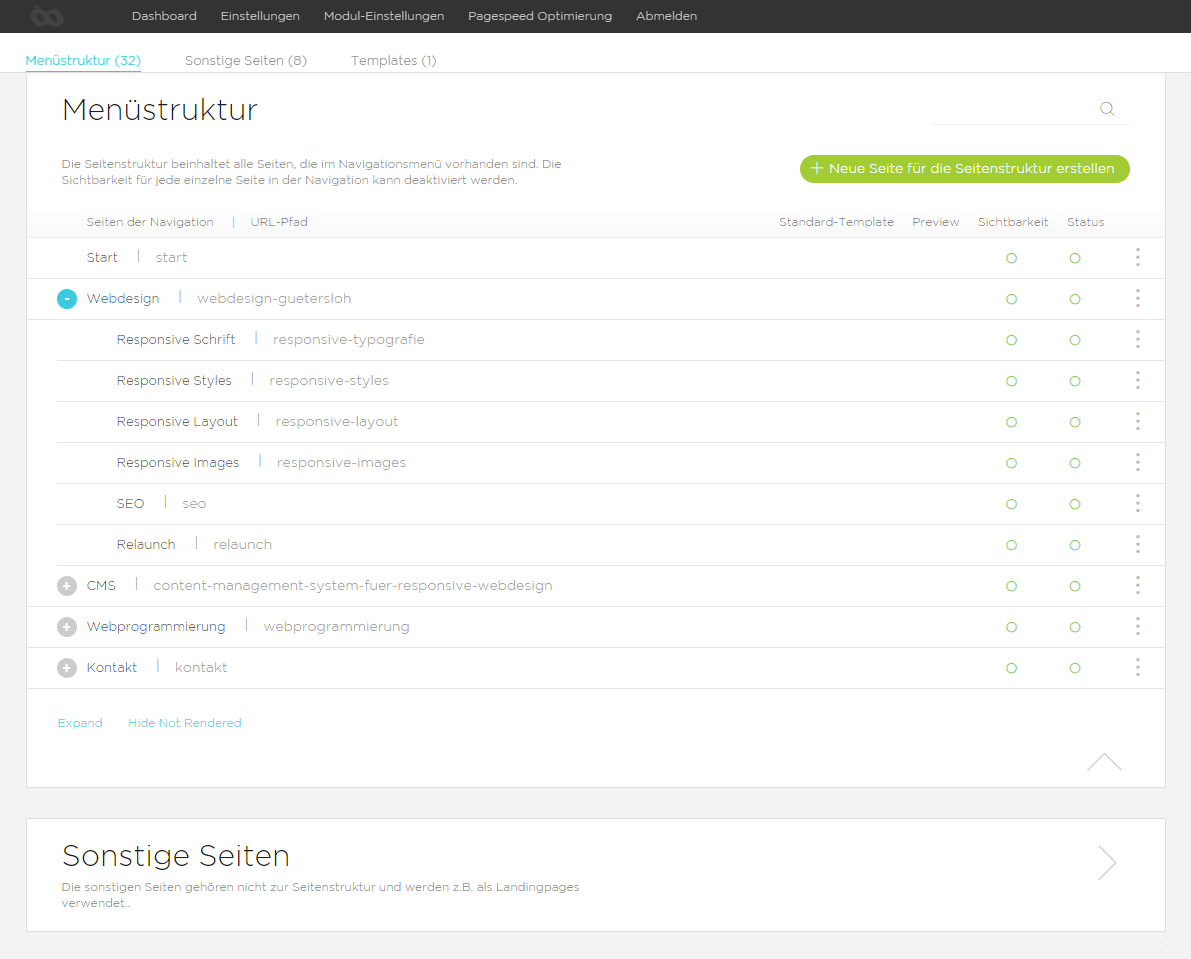 Hier wird die gesamte Website-Struktur abgebildet und kann einfach bearbeitet werden.