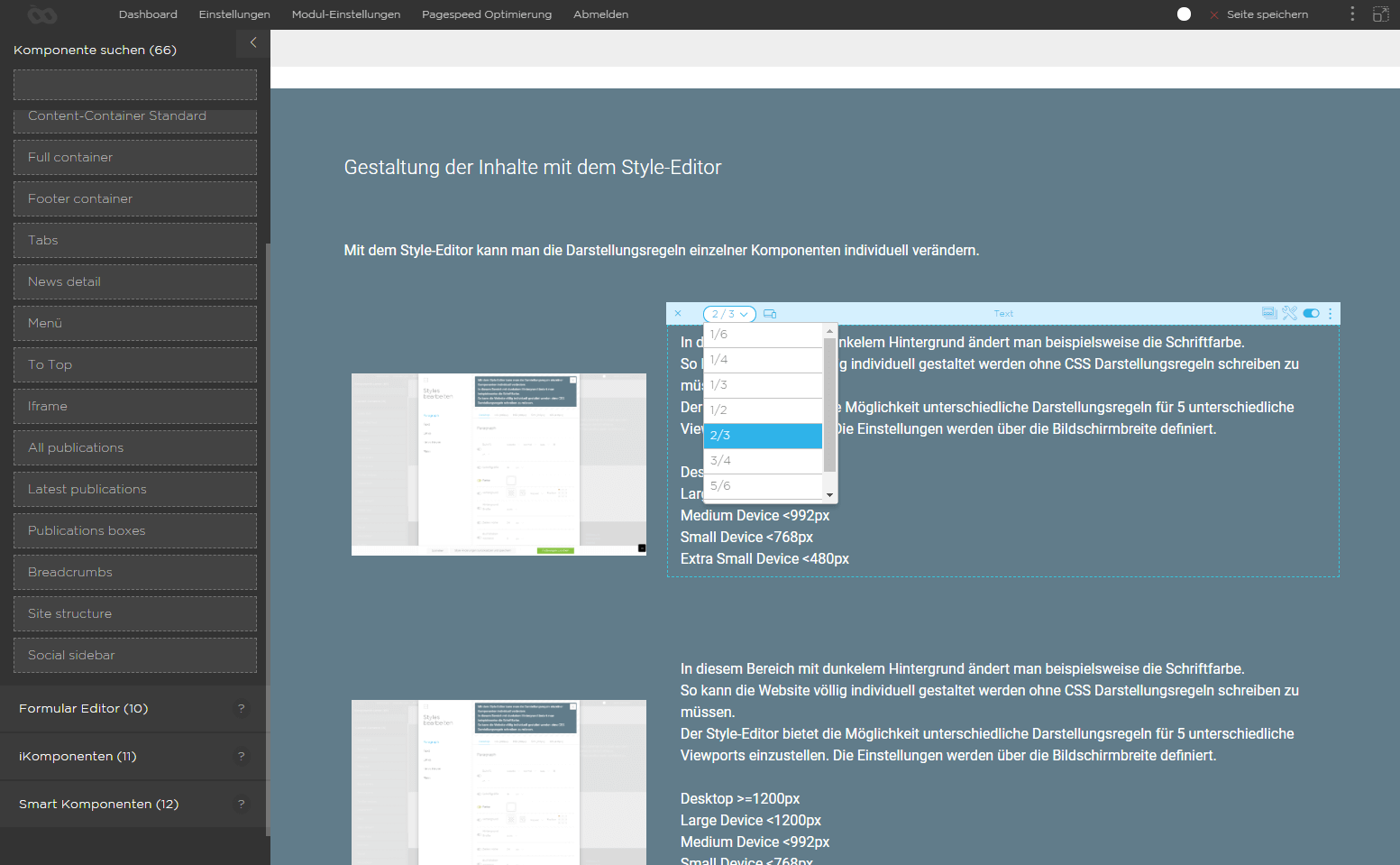 Wie die Inhalte dargestellt werden kann einfach über grundlegende Moduleinstellungen für den gesamten Internetauftritt definiert werden oder der Administrator ändert die Darstellungsregeln für ein Content-Modul über ein zusätzliches Menü, das wir Style Editor nennen.
